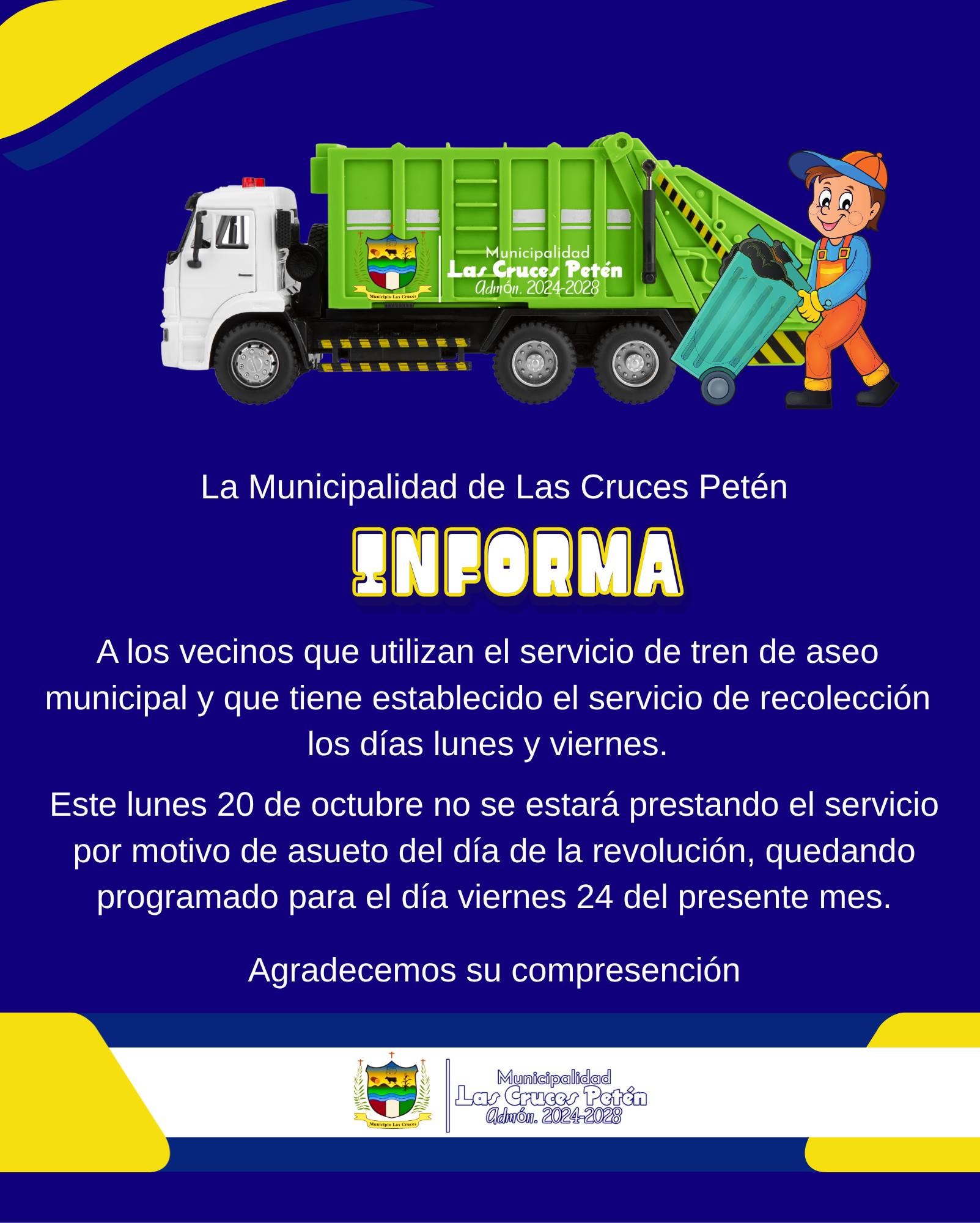 A todos los usuarios del servicio de recolección de basura que brinda esta municipalidad, les informamos que el día lunes 20 de octubre no se prestará el servicio de tren de aseo por asueto del día de la Revolución.