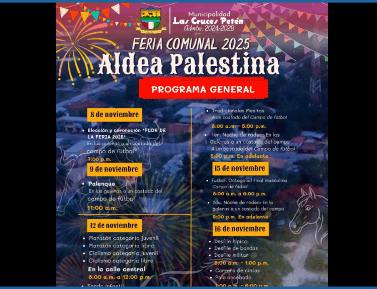 Cultura y TradicionesDesarrollo Social Programa General Feria Comunal, Aldea Palestina las Cruces Petén 2025 By Muni Las Cruces 6 de noviembre de 2025 Read More